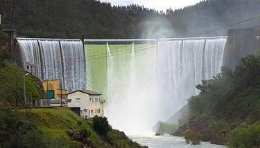 Barragens portuguesas. Interior, descargas de superfície e centrais hidroelétricas de produção de energia. Funcionamento de eclusas.