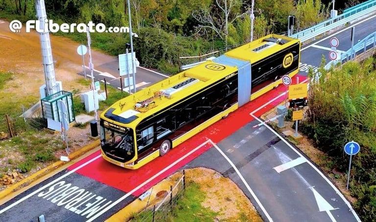 Funcionamento das barreiras automáticas nas Passagens de Nível rodoviárias no canal do metrobÚs no troço suburbano do novo Sistema de Mobilidade do Mondego (metromondego.pt).